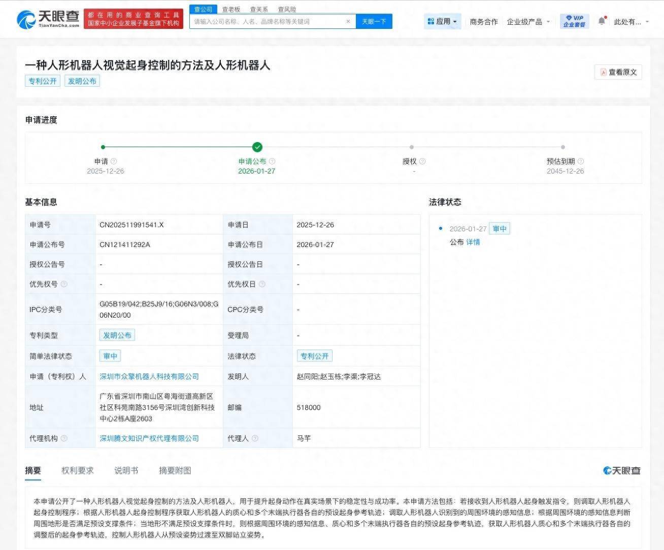 天眼查学问产权信息显露,近日开云kaiyun官方网站,深圳市众擎机器东说念主科技有限公司苦求的“一种东说念主形机器东说念主视觉起身步骤的设施及东说念主形机器东说念主”专利公布。