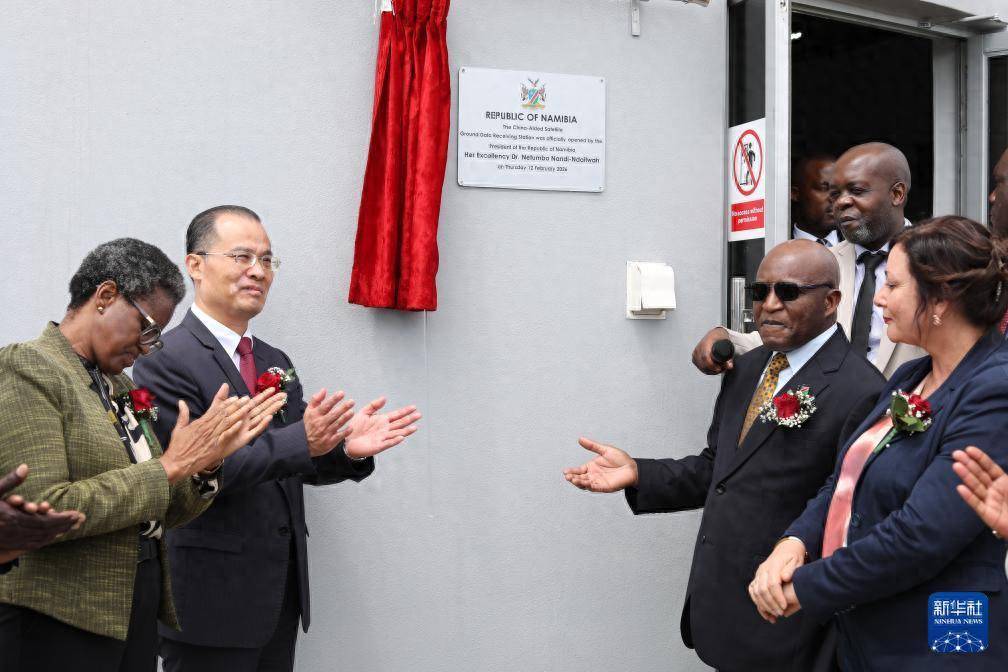 2月12日,在纳米比亚齐门温得和克,纳米比亚总理恩古拉雷(前右二)等出席中国援纳卫星大地数据收受站嘱咐庆典。新华社记者 林晶 摄