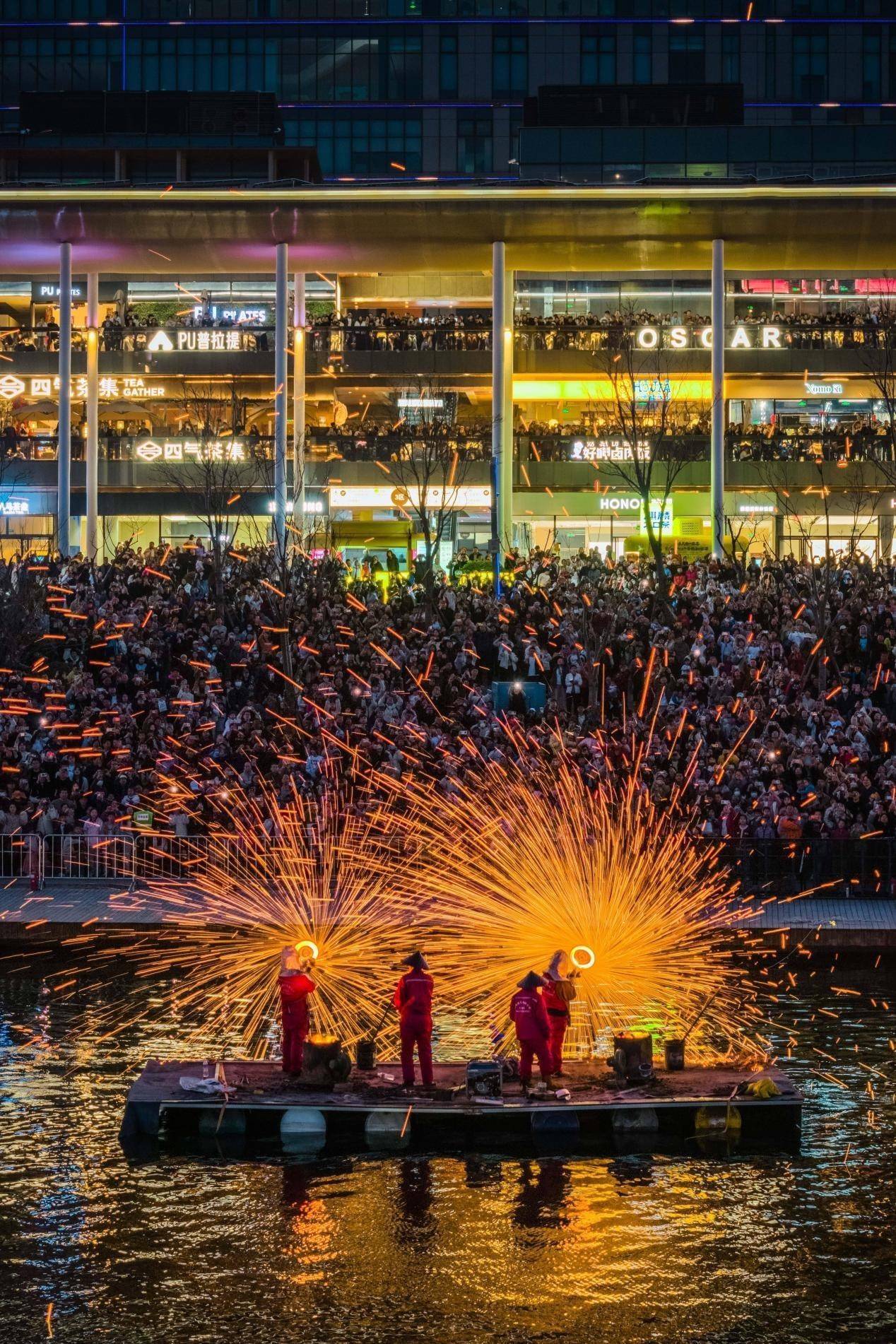 瑰丽已而,打铁花惊艳水岸。水上打铁花可谓是最受瞩目标“压轴大戏”。正月初三至初五,每晚两场饰演在锦鲤池水域瑰丽登场,匠东说念主击打铁水,万令嫒花如流星雨散落湖面,千年非遗工夫与当代水岸交相照映,每场饰演招引数千东说念主驻足,欢喜声雄起雌伏。