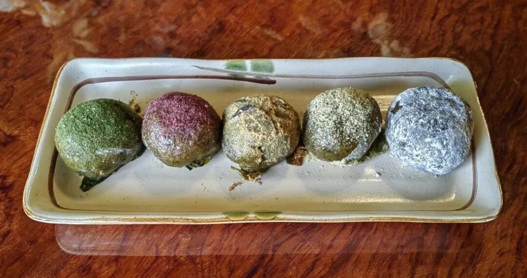 田艾和花茶粉作念的五彩青团(允斌 | 摄)