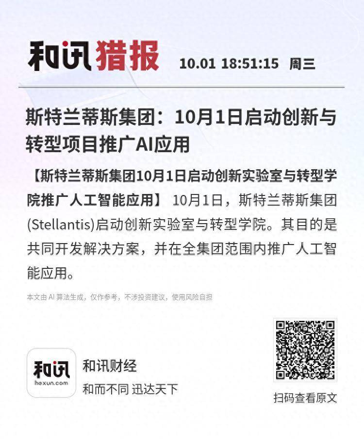 【斯特兰蒂斯集团10月1日开动编削实验室与转型学院施行东谈主工智能期骗】10月1日,斯特兰蒂斯集团(Stellantis)开动编削实验室与转型学院。其观念是共同配置贬责决议开云kaiyun.com,并在全集团领域内施行东谈主工智能期骗。