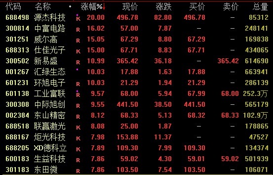 CPO看法等AI产业链股集体走高,摈弃收盘,源杰科技20%涨停,中富电路、威尔飞扬超15%,新易盛涨超10%,工业富联、中际旭创等涨逾9%。
