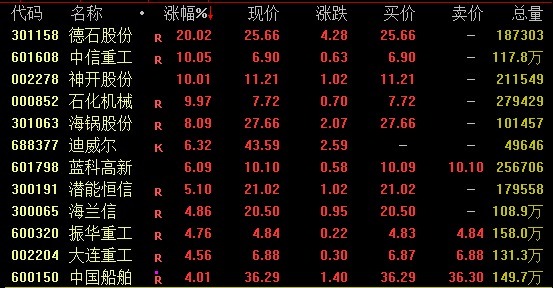 海洋经济看法盘中强势拉升,摈弃收盘,德石股份、中信重工、神开股份、石化机械涨停且斩获2连板;海锅股份涨超8%。