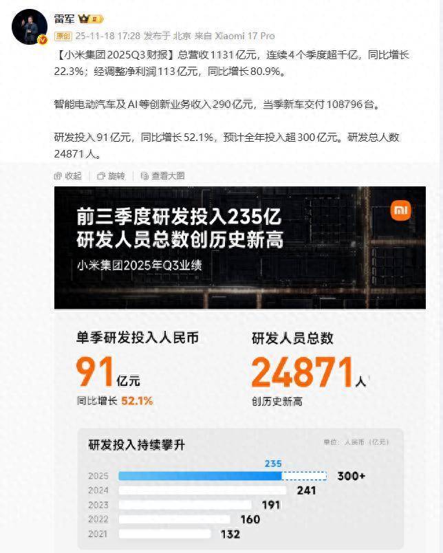 18日晚间,小米创办东谈主,董事长兼CEO雷军在微博发文称,研发干预91亿元,同比增长52.1%,瞻望全年干预超300亿元。研发总东谈主数24871东谈主。